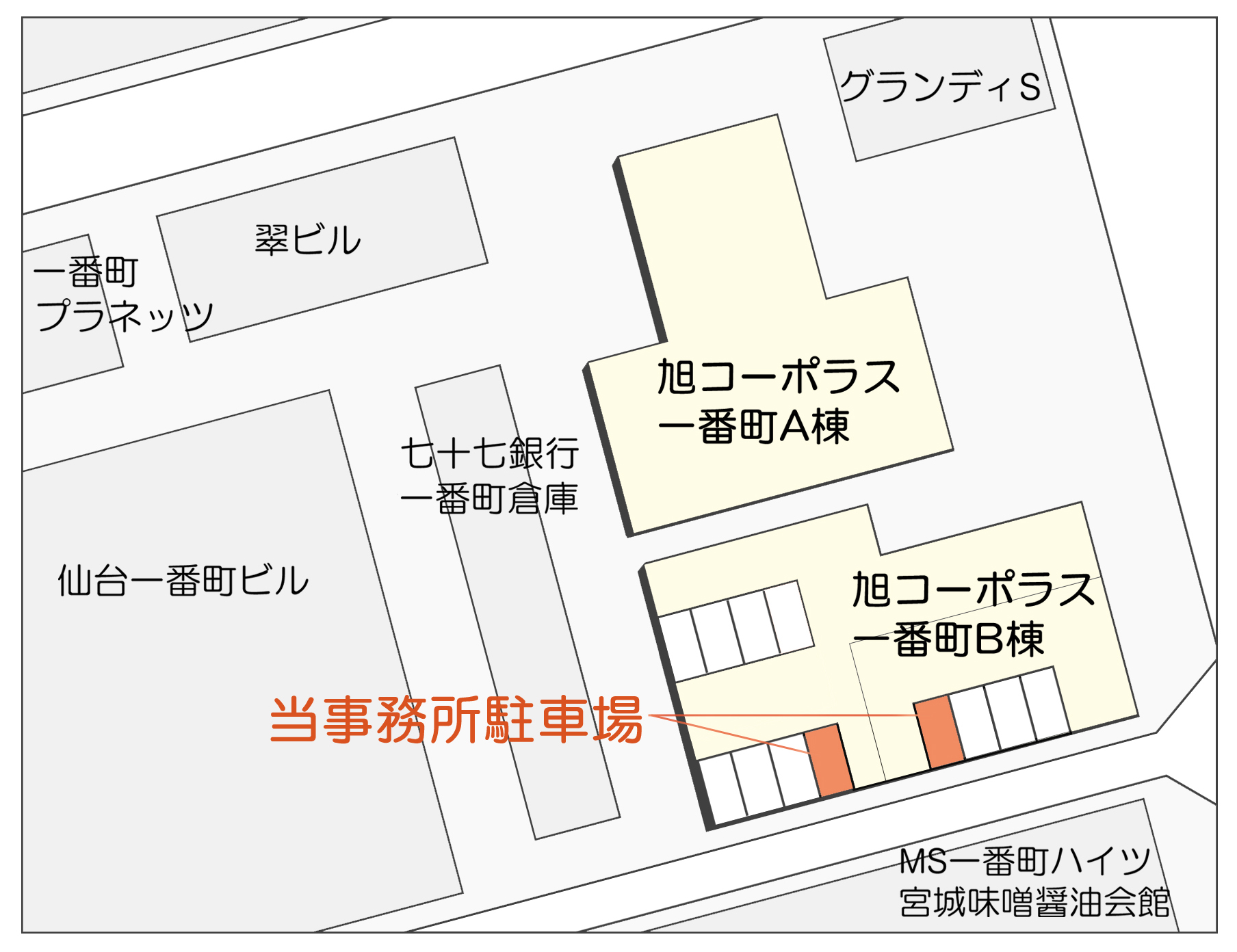 場所は以下の地図の通りですが、後記詳細図記載、当事務所専用駐車場をご利用下さい。2台分用意しております。